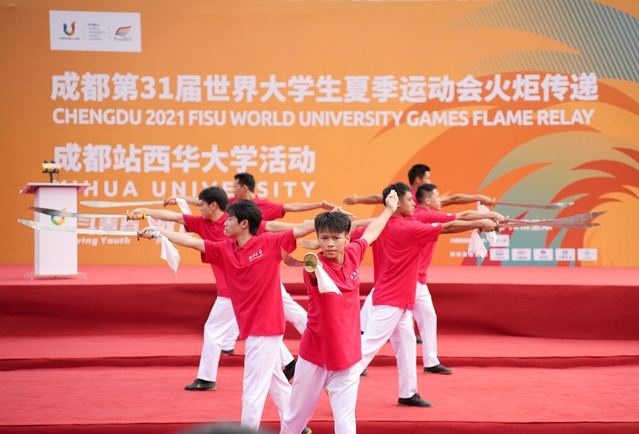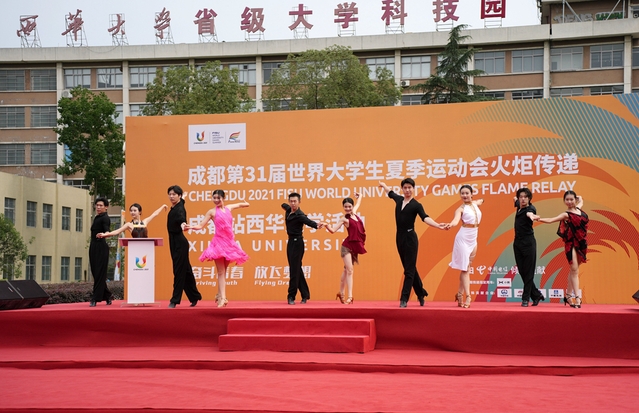 在精彩的武术、拉丁舞表演后,上午10:20,西华大学校长李秋实宣布成都第31届世界大学生夏季运动会成都站西华大学火炬传递开始。伴随着成都大运会火炬传递主题曲《我们都是追梦人》的旋律,首棒火炬手、前中国女排队员、雅典奥运会女排冠军队员陈静高擎火炬,开始了在西华大学的火炬传递。