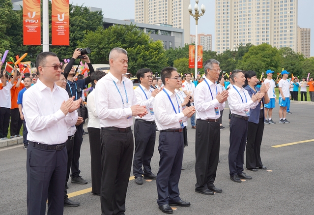 四川省人民政府副秘书长、成都大运会组委会副秘书长刘全胜,四川省教育厅体育卫生与艺术教育处一级调研员赖英莉,四川省体育局党组成员、副局长、四川体育职业学院党委书记陈兴东,成都大运会执委会机关党组成员、执委会宣传部(开闭幕式部)党组副书记、专职副部长张瑞琴,成都大运会执委会宣传部(开闭幕式部)专职副部长黄东,成都大运会执委会宣传部(开闭幕式部)高级主管何小梅,郫都区政府区长、郫都赛区委员会主任赵继东,西华大学党委书记刘树根,校长李秋实,党委副书记、纪委书记朱燕萍,党委副书记张力,副校长刘小兵出席火炬传递仪式。